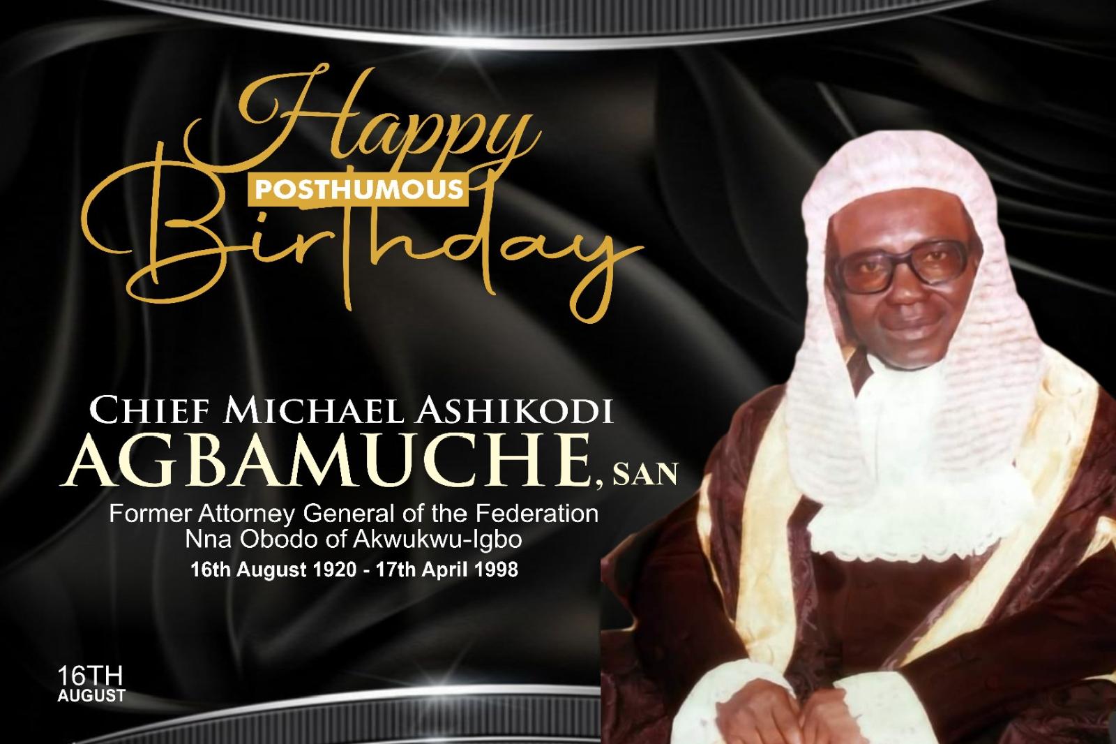 Chief Michael Ashikodi Agbamuche, SAN who was born on Monday, 16 August, 1920 and died Friday, 17 April, 1998 at the ripe age of 78, was well-known for his humanitarian activities, compassion, service to the nation and legal expertise.