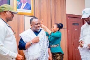 The visit, which was brief but colourful, provided an opportunity for the youths to appreciate the Executive Chairman for his sustained support to youth initiatives over the years. In recognition of his contributions, the youth leaders honoured Hon. Chinye with the traditional Anioma attire (akwa-ocha) and presented him with an appreciation card, accompanied by prayers for continued success and divine favour in his life.