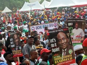 Elumelu who was formally presented to the people as the candidate of the Party for House of Representatives for Aniocha/Oshimili Federal Constituency by the State Party Chairman, Olorogun Kingsley Esiso along with the Delta North Senatorial Candidate of the Party, Hon. Prince Ned Nwoko and State House of Assembly candidates for Aniocha North and South State constituencies, Hon. Engr. Emeke Nwaobi, and Hon. Isaac Anwuzia, Barr. Bridget Anyafulu for Oshimili South and Barr. Frank Esenwa  for Oshimili South respectively, said the tumultuous crowd of  people that came out to accord the State Governor and the Vice-presidential Candidate of the Party, Senator Dr Ifeanyi Okowa, the State Governorship Candidate; Rt. Hon Sheriff Oborevwori, his deputy, Chief Monday Onyeme, the State Chairman of the Party, Olorogun Kingsley Esiso and leaders of the party in the State, a rousing reception, was a clear statement that the Federal Constituency remains the home base for the Peoples Democratic Party, PDP.